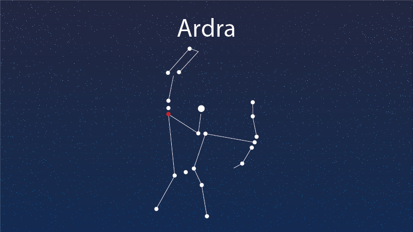 Ardra means wetting. A big red star situated in the north-west corner of the Orion constellation is called Ardra constellation. The scientific name of this star is Alpha Mrig and the western name is Betulguz. This red star is about 240 light years away from us, the diameter of this giant star is about a hundred times more than the diameter of the Sun. If Ardra takes the place of the Sun, then all the planets up to Mars will fit into its belly. When the Sun enters this constellation (22 June to 4 July), rain starts. Therefore, the meaning of this constellation 'Ardra' is associated with the arrival of rain. According to the Puranas, Ardra is the wife of Rudra Shankar, the deity of this constellation.