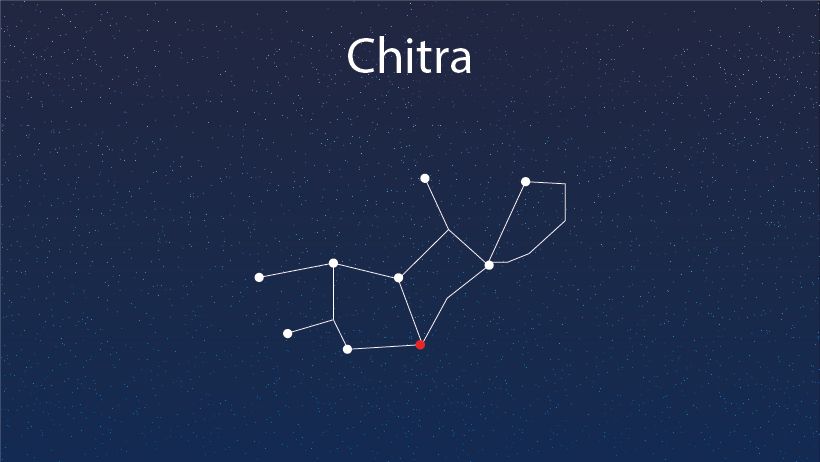 The month of Chaitra was named after this constellation. There is only one star in this constellation, which is of pure white colour and bright. Due to being very attractive and bright, this constellation was named Chitra. Its western name is Spica, which means wheat ear. In the western imaginary picture of Virgo constellation, wheat ear is shown in the left hand of 'Virgo'. This Chitra constellation is situated in place of this wheat ear. This star is 160 light-years away from us. Chitra star emits radiation equal to six hundred suns. Due to the wheat crop ripening and being harvested in the month of Chaitra of this constellation, it was associated with the symbol of wheat ear in China, Egypt, Persia and Europe.