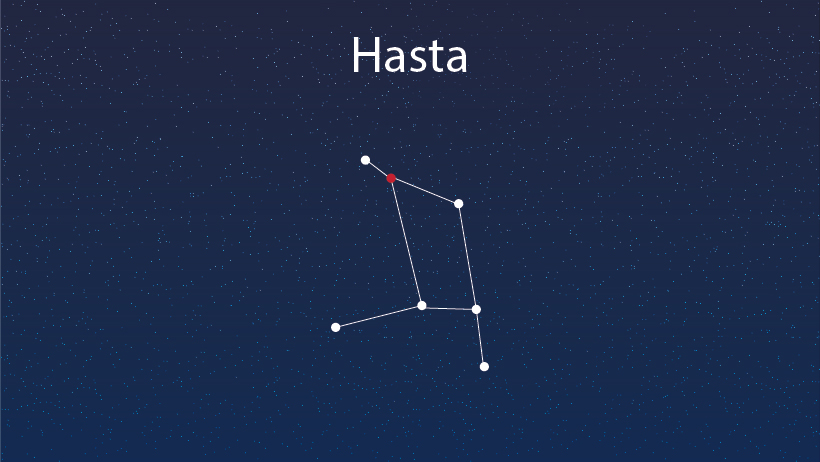 This constellation of five stars is considered to be the hand (Hasta) of Vedic Prajapati; in Hindi-speaking rural areas it is known as 'Hathiya' constellation. In western astrology it is called Corvus (Kag, Crow). The brightest star of this constellation is Gamma Corvus, a super-heated white giant. This constellation can be easily identified in the southern sky by the quadrilateral shape formed by its four stars. When the Sun enters this constellation, the last major rain of the rainy season takes place, which is of great importance from the agricultural point of view.