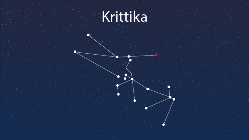 Krittika means woven or net. Actually it is a white cluster of many stars, which looks like a net woven from stars. It is identified in the sky by its combined brightness. According to Taittiriya Brahman, Krittikas are seven sisters. Their names are Amba, Dula, Nittani, Abhrayanti, Meghayanti, Varshayanti and Chupunika. According to mythology, the six Krittikas raised Kartikeya by feeding him milk like a mother, that is why Kartikeya was called Shanmatur. Its western name is 'Pleiades', which means 'crowd'. According to a Greek legend, these were the daughters of Atlas, who held the world on his shoulders, whom Atlas, being pleased, placed in the sky. The main stars of this constellation are super-hot giants and their surface temperature is more than 15,000 degrees centigrade.