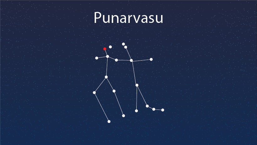 Punarvasu means two (stars) that give wealth again. When the Sun reaches this constellation of two stars in the rainy season, by then the crops that give wealth and grains have sprouted and are flourishing. Probably that is why it is called Punarvasu Nakshatra. Punarvasu Nakshatra is made up of two stars of Gemini zodiac, whose scientific names are Alpha and Beta Gemini and Greek names are Castor and Pollux respectively. In Greek belief, both of them are twin brothers. In this, Pollux star is an ordinary orange star and is 45 light years away from us, but Castor is a super hot blue star and this star which appears as one is actually a group of six stars situated together. The above two twin brothers named Castor or Pollux are called Dioscuri in Greece and their character matches with the medical nature of Indian god Ashwini Kumar.