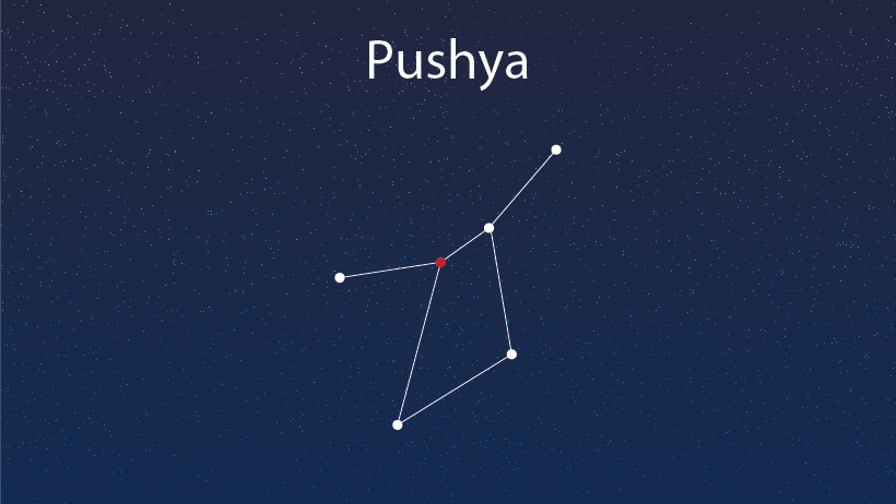 Pushya means the one who strengthens. When the Sun comes in the Ardra constellation, the vegetation of the earth gets strengthened, probably that is why this constellation was named Pushya. Another name of this constellation is Tishya, which means auspicious or one who gives satisfaction. The month of Paush (Push) was named after this constellation. People imagine the shape of an arrow in this constellation of three faint stars situated in the center of Cancer zodiac. The main star of this constellation is Delta Cancer, which is located exactly on the path of the Sun. This constellation is said to provide success, hence one of its names is Siddhya.